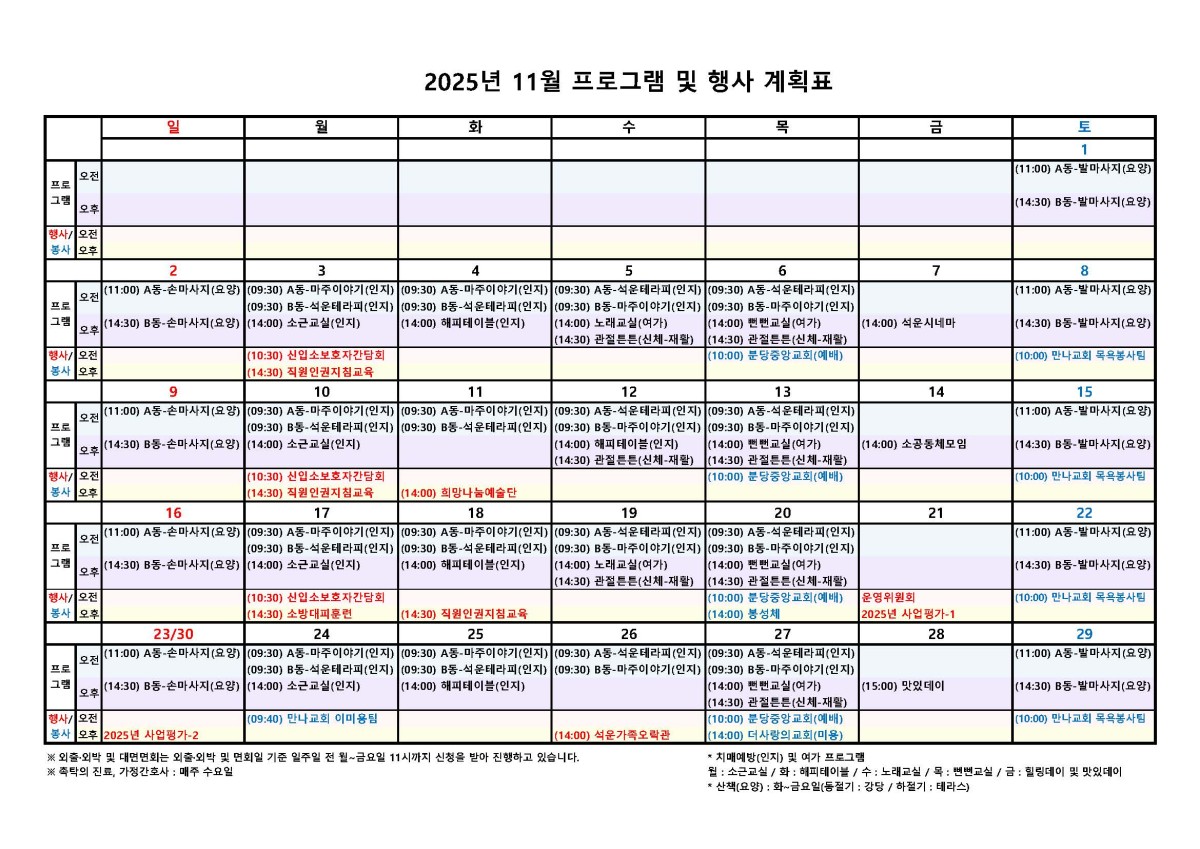 [행사프로그램] 2025년 11월 프로그램 및 행사 계획표 페이지 정보 작성자최고관리자 조회 19회 작성일 2025-10-31 08:52:00 댓글 0 list_alt목록 본문 다음글2025년 10월 프로그램 및 행사 계획표 arrow_forward list_alt 댓글 0 등록된 댓글이 없습니다.